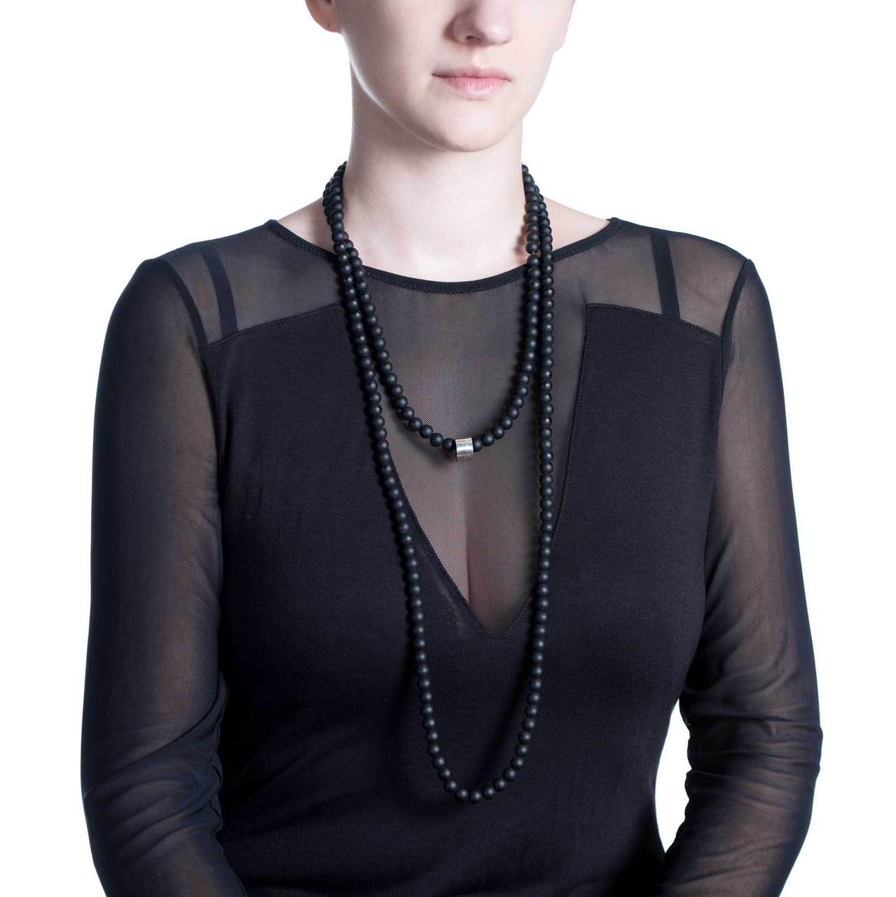 Pikk kee Matte on valmistatud naturaalsetest mati viimistlusega oonüksi helmestest. Mööda keed liigub helmestel taaskasutatud hõbedast rõngas, mis kannab Seco logo.