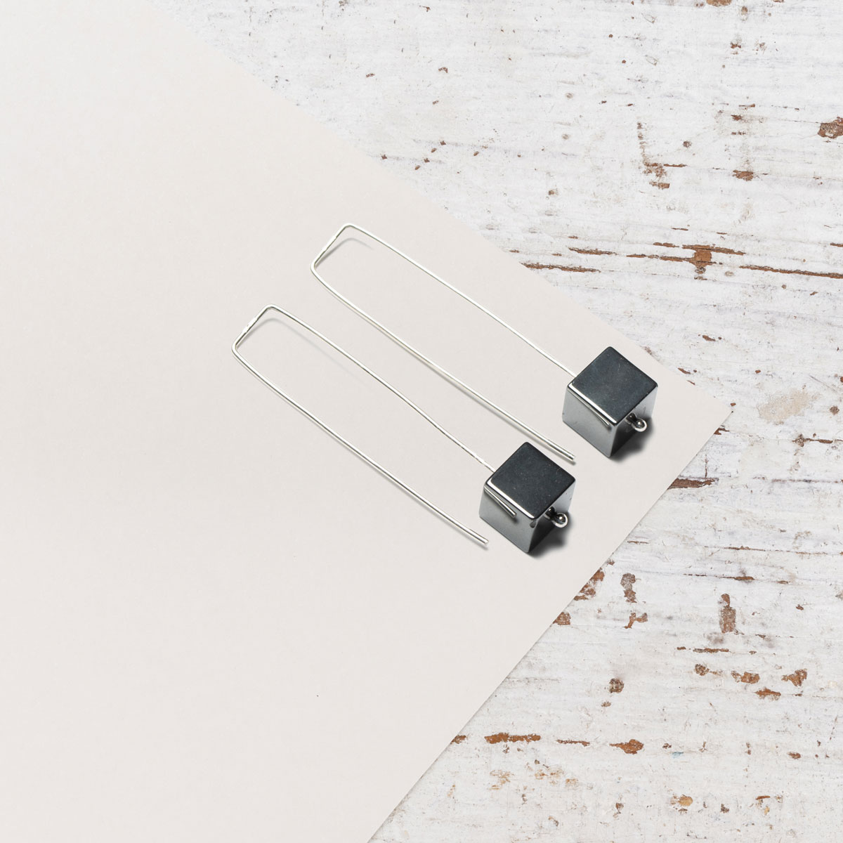 Kõrvarõngad on valmistatud hõbedast ja hematiidist. Kõrvarõngad on kantavad mõlemat pidi, nii pikem kui ka lühem pool ees.